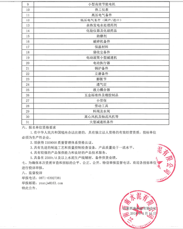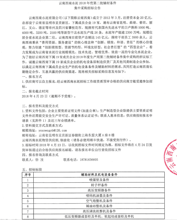 【水泥人網(wǎng)】云南西南水泥有限公司(以下簡稱云南西南)成立于2012年3月,注冊資本金20億元,總部設(shè)于云南省昆明市呈貢新區(qū),下屬成員企業(yè)19家,遍布云南省昆明、曲靖、普洱、麗江、文山、德宏等市州及四川省攀枝花市,現(xiàn)擁有代表國內(nèi)先進水平的日產(chǎn)熟料5000噸、4000噸、3200噸、2500噸等新型干法水泥生產(chǎn)線26條,水泥年產(chǎn)能逾2300萬噸,規(guī)模位居全省水泥企業(yè)第二位。云南西南目前資產(chǎn)總額達145億元,擁有干部員工3900余人。云南西南秉承“善用資源、服務(wù)建設(shè)”的核心理念和“創(chuàng)新、績效、和諧、責任”的核心價值觀,努力創(chuàng)建“創(chuàng)新績效型、資源節(jié)約型、環(huán)境友好型、社會責任型”的“四型企業(yè)”,著力發(fā)展成為云南省水泥行業(yè)規(guī)模領(lǐng)先、技術(shù)先進、管理優(yōu)秀、效益一流的專業(yè)化水泥企業(yè)。為了做好云南西南下屬19家成員企業(yè)2017年度生產(chǎn)用第二批輔材備件集中采購的招議標工作,誠邀云南西南下屬19家成員企業(yè)的機電設(shè)備原制造供貨廠及其它同類制造企業(yè)參加,以滿足云南西南下屬成員企業(yè)生產(chǎn)的機電設(shè)備備件及輔助材料的需求,共同打造云南西南長期穩(wěn)定合作、互惠共贏的供應(yīng)商渠道?,F(xiàn)將相關(guān)招標采購信息發(fā)布如下: