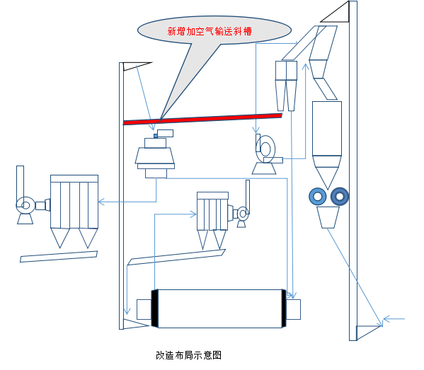 根據(jù)1#磨系統(tǒng)的旋風(fēng)筒(雙筒)收集的物料分析,有30-40%的成品進(jìn)入磨內(nèi)再粉磨,形成了磨機(jī)過粉磨現(xiàn)象。對(duì)旋風(fēng)筒(雙筒)的物料走向進(jìn)行改造,把兩個(gè)旋風(fēng)筒其中的一個(gè)用斜槽把物料送到磨尾斗提進(jìn)入選粉機(jī)進(jìn)行選粉,(由于受磨尾500斗提提料能力的制約,暫對(duì)一個(gè)旋風(fēng)筒的物料接斜槽改入磨尾500斗提,)直接經(jīng)選粉機(jī)進(jìn)入成品。