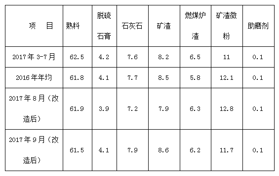 從上表看出:在改造前后物料配比變換不大。助磨劑使用大連萬象公司的助磨劑,質(zhì)量沒有變化。