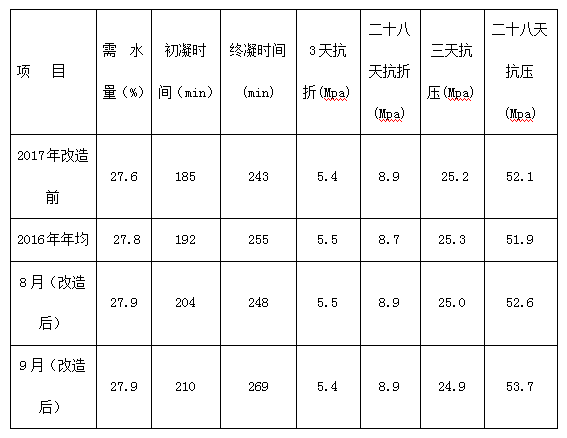 從上表看出:改造前后需水量增加了0.3%,二十八天強(qiáng)度增加了1.6Mpa,其他檢驗(yàn)項(xiàng)目性能變化不大。