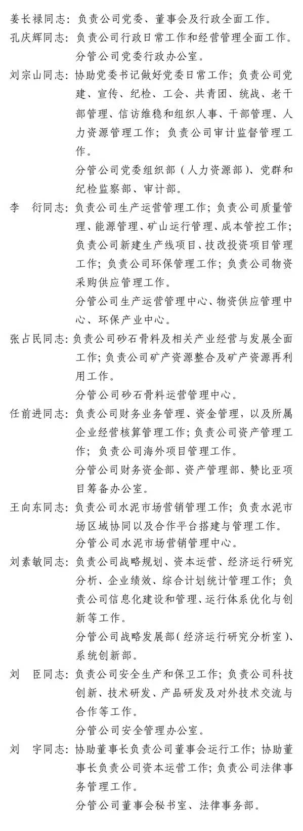 姜長祿:男,漢族,1965年5月出生,北京科技大學畢業(yè),工學碩士,高級經(jīng)濟師,中共黨員。1987年8月至2005年11月歷任北京市琉璃河水泥廠技術(shù)科監(jiān)督員、原料車間技術(shù)員、新線分廠操作員、生產(chǎn)安全處副處長、運輸公司副經(jīng)理、供應處處長和支部書記、生產(chǎn)管理部副部長和總調(diào)度長、供應部長、副廠長(其間1989年5月至1990年9月伊拉克巴杜什水泥廠操作員);2005年11月至2011年5月歷任北京金隅集團股份有限公司水泥事業(yè)部副部長、部長,水泥分公司副經(jīng)理,北京金隅水泥經(jīng)貿(mào)有限公司經(jīng)理,河北太行水泥股份有限公司副總經(jīng)理、董事長;2011年5月至2015年10月歷任北京金隅集團股份有限公司水泥事業(yè)部部長、北京金隅水泥經(jīng)貿(mào)有限公司經(jīng)理;2015年10月至2016年5月歷任北京金隅集團股份有限公司總經(jīng)理助理、水泥事業(yè)部部長、北京金隅水泥經(jīng)貿(mào)有限公司經(jīng)理;2016年5月至2017年9月歷任北京金隅集團股份有限公司黨委常委、副總經(jīng)理、水泥事業(yè)部部長、北京金隅水泥經(jīng)貿(mào)有限公司經(jīng)理,唐山冀東水泥股份有限公司黨委書記、副董事長。2017年9月至今任北京金隅集團股份有限公司黨委常委、副總經(jīng)理;2017年9月至今任唐山冀東水泥股份有限公司黨委書記、董事長。
