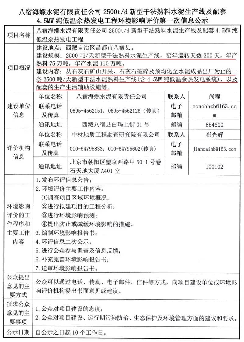 2018年3月5日西藏昌都八宿縣政府官網(wǎng)發(fā)布了《八宿海螺水泥有限責(zé)任公司環(huán)境影響評價第一次信息公示》公示內(nèi)容如下: