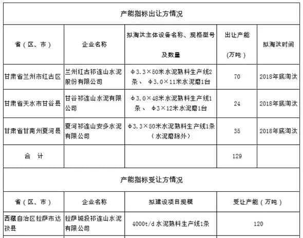 公示顯示,將于2018年底淘汰的三家水泥企業(yè)(合計產(chǎn)能129萬噸)均位于甘肅省境內(nèi),而產(chǎn)能指標(biāo)受讓方位于西藏自治區(qū)拉薩市達(dá)孜縣,受讓產(chǎn)能120萬噸。