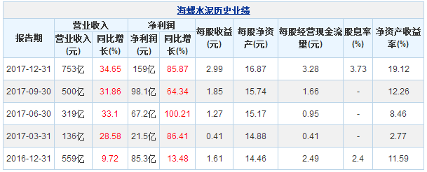 海螺水泥3月23日最新公布的2017年年報(bào)顯示,其營業(yè)收入753億元,同比增長34.65%;歸屬于上市公司股東的凈利潤159億元,同比增長85.87%。基本每股收益2.99元。