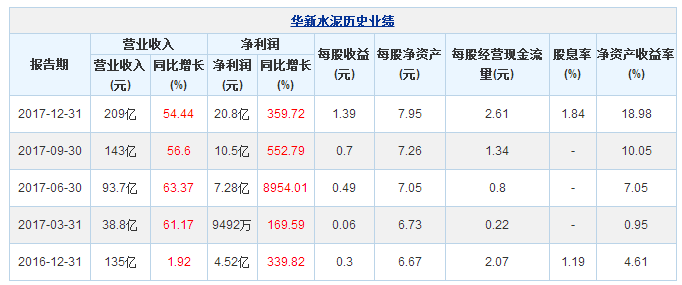 2017年,華新積極貫徹執(zhí)行國家在供給側(cè)結(jié)構(gòu)性改革、環(huán)保督查及錯(cuò)峰生產(chǎn)等方面的政策,著力實(shí)施“環(huán)保轉(zhuǎn)型、海外發(fā)展、電商創(chuàng)新、高新建筑材料拓展”戰(zhàn)略,以安全生產(chǎn)為基礎(chǔ),以“三個(gè)聚焦”為抓手,以創(chuàng)新發(fā)展為方向,加快推進(jìn)環(huán)保、骨料、新材料等新興業(yè)務(wù)發(fā)展,2017年度公司經(jīng)營業(yè)績再創(chuàng)歷史新高。華新水泥3月26日公布的2017年年報(bào)顯示,其營業(yè)收入209億元,同比增長54.44%;歸屬于上市公司股東的凈利潤20.8億元,同比增長359.72%。