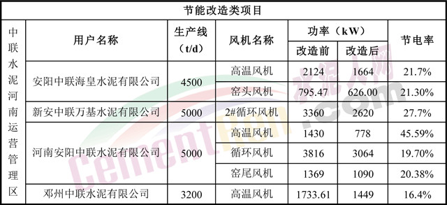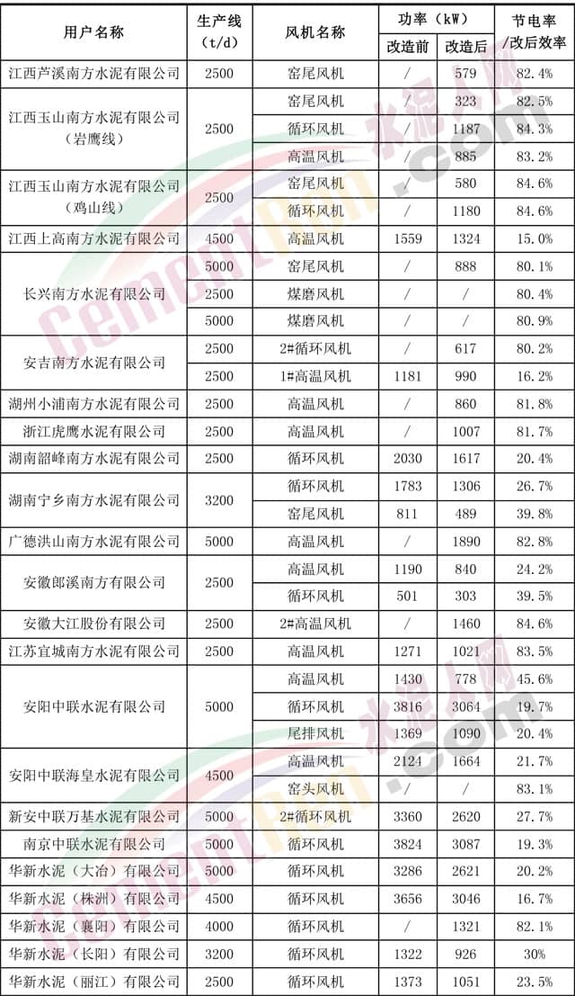 上海瑞晨水泥行業(yè)風(fēng)機(jī)節(jié)能改造業(yè)績(部分)