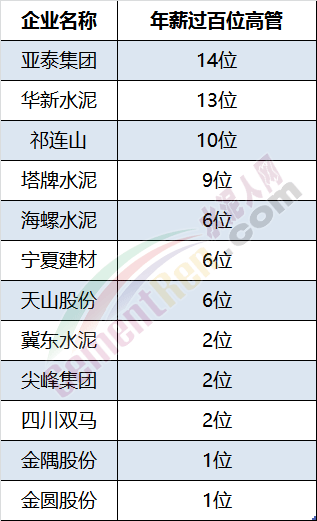 其中亞泰集團有14位高管年薪過百萬,華新水泥有13位高管年薪過百萬。是百萬年薪最多的水泥企業(yè)。
