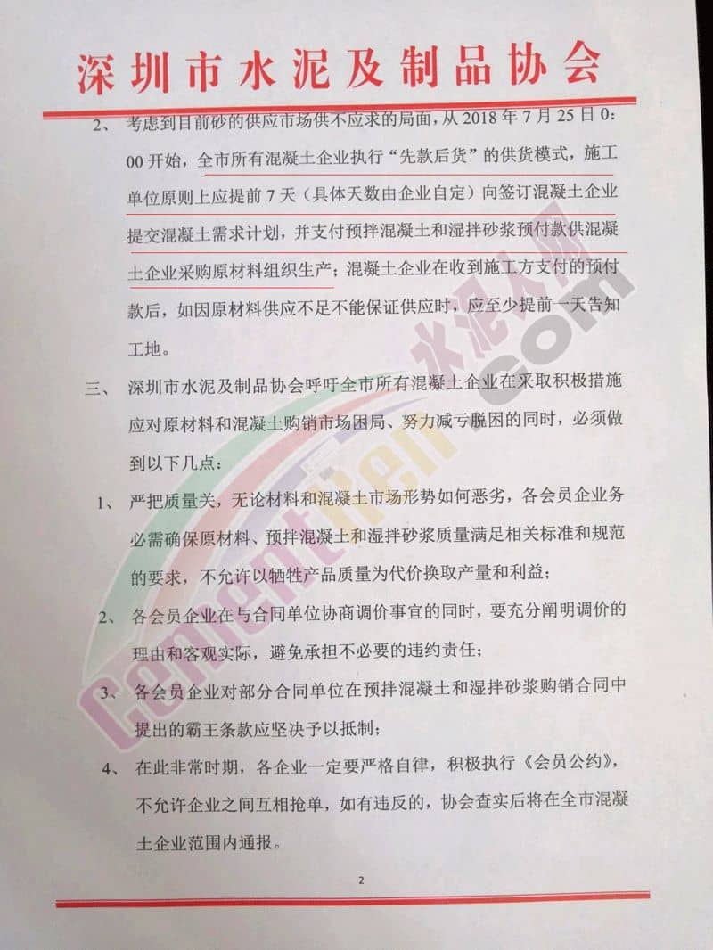 2、考慮到目前砂的供應(yīng)市場(chǎng)供不應(yīng)求的局面,從2018年7月25日0點(diǎn)開始,全市所有混凝土企業(yè)執(zhí)行“先款后貨”的供貨模式,施工單位原則上應(yīng)提前7天(具體天數(shù)由企業(yè)自定)向簽訂混凝土企業(yè)提交混凝土需求計(jì)劃,并支付預(yù)拌混凝土和濕拌砂漿預(yù)付款供混凝土企業(yè)采購原材料組織生產(chǎn);混凝土企業(yè)在收到施工方支付的預(yù)付款后,如因原材料供應(yīng)不足不能保證供應(yīng)時(shí),應(yīng)至少提前一天告知工地。