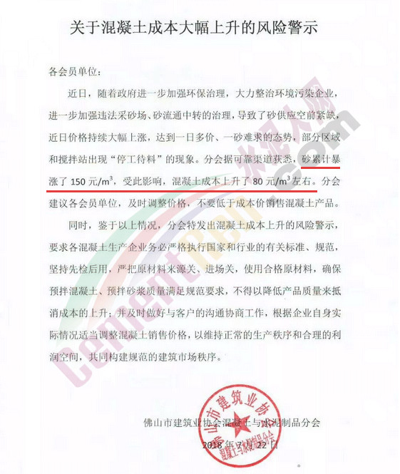 廣州市混凝土行業(yè)協(xié)會(huì)發(fā)布“重要警示”稱,隨著國家對(duì)砂、石場(chǎng)環(huán)保督查整治進(jìn)一步深入,砂、石骨料供不應(yīng)求,特別是砂嚴(yán)重缺貨,個(gè)別地區(qū)已經(jīng)無砂可賣,有余砂的也瘋狂調(diào)高售價(jià),這對(duì)砼行業(yè)是一次嚴(yán)重沖擊,砂石市場(chǎng)已亮起了紅燈!目前砂、石主要矛盾已經(jīng)不是升多少價(jià)問題了,而是有沒有砂賣的問題了。
