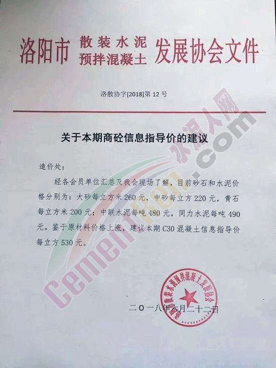 洛陽市散裝水泥預(yù)拌混凝土發(fā)展協(xié)會(huì)發(fā)布關(guān)于本期商砼信息指導(dǎo)價(jià)的建議,建議稱,經(jīng)各會(huì)員單位匯總及協(xié)會(huì)現(xiàn)場(chǎng)了解,目前砂石和水泥價(jià)格分別為:大砂每立方米260元,中砂每立方220元,青石每立方200元,中聯(lián)水泥480元/噸,同力水泥490元/噸,鑒于原材料價(jià)格上漲,建議本期C30混凝土信息指導(dǎo)價(jià)每立方530元。