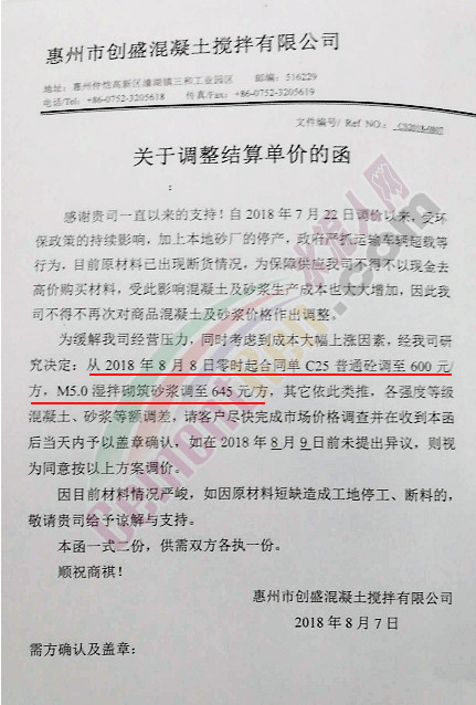 在砂石價(jià)格暴漲且嚴(yán)重缺貨,又趕上物流整治,嚴(yán)查大貨車超載運(yùn)輸?shù)榷嘀乇尘跋拢掠位炷疗髽I(yè)只能現(xiàn)金交易,一天一價(jià)?;葜菔袆?chuàng)盛混凝土攪拌有限公司發(fā)布調(diào)整結(jié)算單價(jià)的函稱,為緩解公司經(jīng)營壓力,同時(shí)考慮成本大幅上漲因素,決定上調(diào)產(chǎn)品價(jià)格,C25普通砼調(diào)至600元/方,M5.0砂漿調(diào)至645元/方。