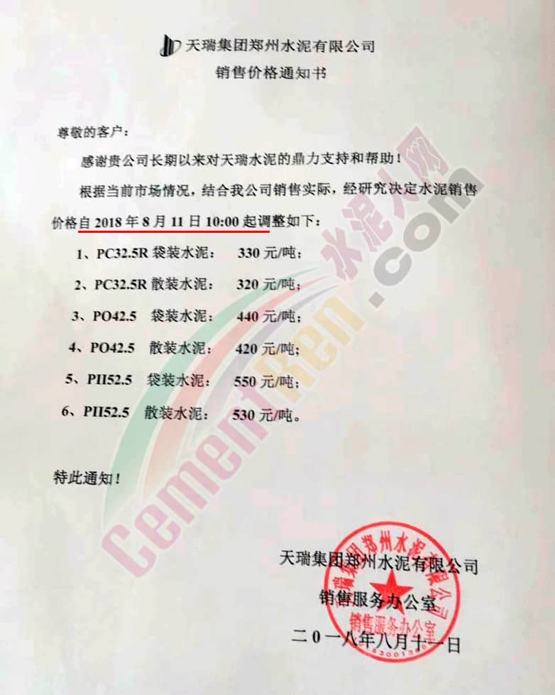 其中:天瑞集團(tuán)鄭州水泥有限公司銷售價(jià)格通知書稱,根據(jù)當(dāng)前市場(chǎng)情況,結(jié)合公司銷售實(shí)際,決定上調(diào)水泥銷售價(jià)格,自8月11日10點(diǎn)起執(zhí)行新價(jià)格。