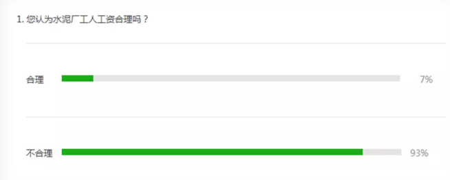 先讓我們回顧一下前幾日水泥人網(wǎng)微信公眾平臺(tái)發(fā)起的您認(rèn)為水泥廠工人工資合理嗎?的民意調(diào)查吧,在短短的1天的時(shí)間內(nèi),有近萬(wàn)人參與了投票,根據(jù)奮斗在一線的水泥工人投票結(jié)果顯示,有93%的人認(rèn)為一線工人工資不合理,剩余7%的工人認(rèn)為工資是合理的。