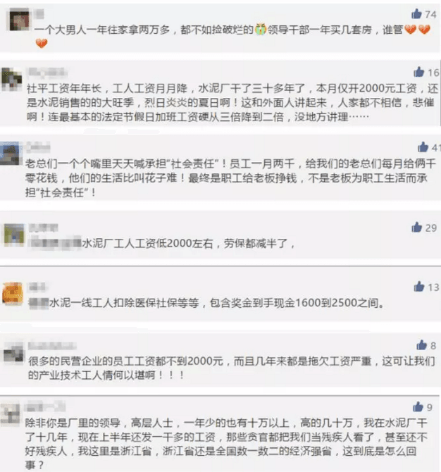 薪資問題永遠(yuǎn)是一個(gè)熱門問話題,因水泥行業(yè)的薪資太低,普通員工薪資在1500~3000元/月不等。有網(wǎng)友留言“一個(gè)大男人一年往家拿兩萬(wàn)多,都不如撿破爛的。”; “一線員工,忍著高溫、噪音、粉塵的危害實(shí)在不容易”;“這個(gè)確實(shí)是血汗錢,夏天熱死,冬天冷死”。水泥行業(yè)生產(chǎn)一線工人的苦累自不必多言。