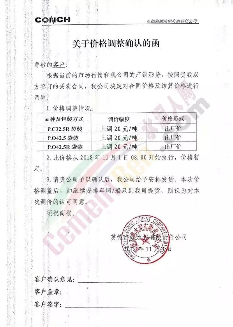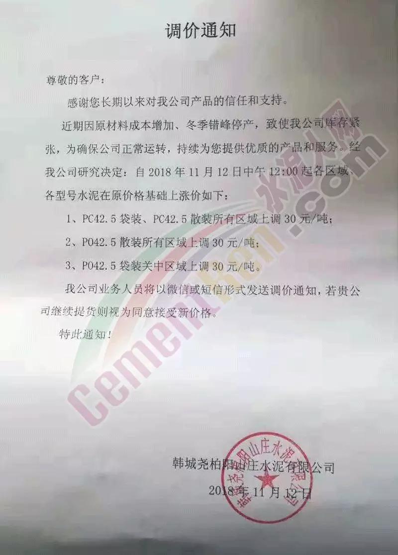 陜西關(guān)中區(qū)域近兩個(gè)月來已經(jīng)四輪上漲,水泥價(jià)格累計(jì)上漲了140元/噸,關(guān)中區(qū)域主導(dǎo)品牌多有排隊(duì)現(xiàn)象,且全部限量供應(yīng)。昨日(12日)中午12時(shí),韓城堯柏陽(yáng)山莊水泥有限公司再次上調(diào)水泥價(jià)格,調(diào)價(jià)通知稱因原材料成本增加,冬季錯(cuò)峰停產(chǎn),致使公司庫(kù)存緊張,為確保公司正常運(yùn)轉(zhuǎn),持續(xù)為客戶提供優(yōu)質(zhì)的產(chǎn)品和服務(wù),經(jīng)公司研究決定上調(diào)各區(qū)域,各型號(hào)水泥價(jià)格。