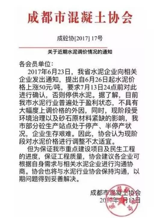 信件指出,“水泥企業(yè)無序漲價,引發(fā)市場混亂”,“且告知混凝土企業(yè),如不在漲價函上簽字確認,將予以停止水泥供應,此舉還從側面引發(fā)了預拌混凝土其他原材料(如粉煤灰、礦粉等)的漲價趨勢,對本來已經岌岌可危的混凝土企業(yè)造成致命一擊。”