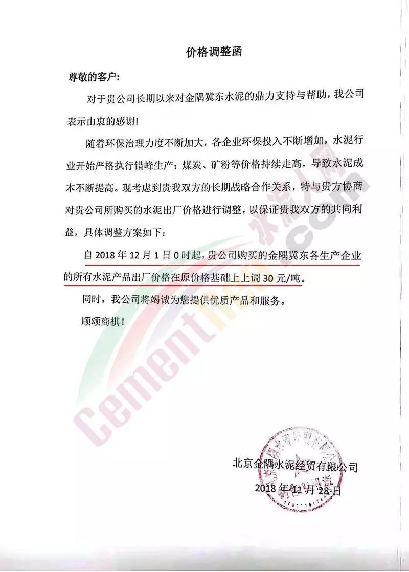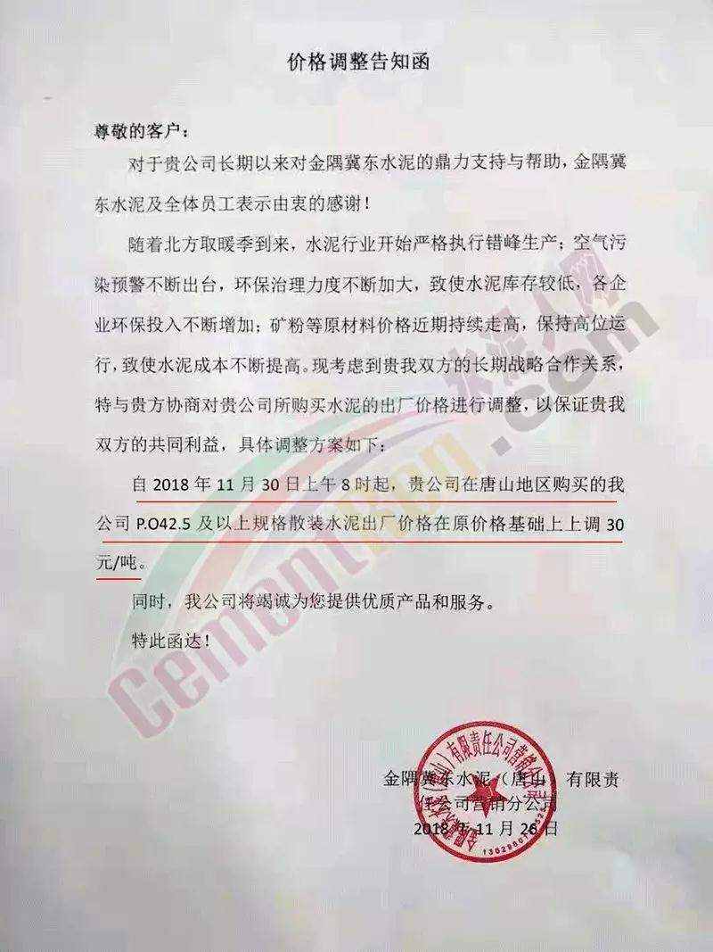 日前,華北地區(qū)主導(dǎo)企業(yè)金隅冀東水泥集中發(fā)布調(diào)價(jià)通知。其中,北京金隅經(jīng)貿(mào)有限公司調(diào)價(jià)通知稱,隨著環(huán)保治理力度不斷加大,各企業(yè)環(huán)保投入不斷增加,水泥行業(yè)開(kāi)始嚴(yán)格執(zhí)行錯(cuò)峰生產(chǎn)。同時(shí),煤炭、礦粉等價(jià)格持續(xù)走高,導(dǎo)致水泥成本不斷提高。企業(yè)將于12月1日起上調(diào)各生產(chǎn)企業(yè)的所有水泥產(chǎn)品出廠價(jià)格,上調(diào)幅度30元/噸。
