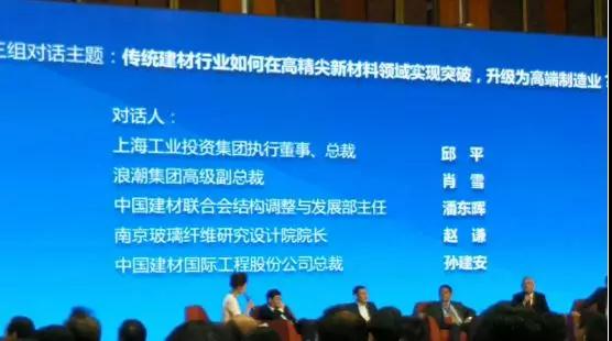 上海工業(yè)投資(集團(tuán))有限公司執(zhí)行董事、總裁邱平,浪潮集團(tuán)高級副總裁、中國檢驗檢測學(xué)會質(zhì)量鏈工作委員會主任肖雪、中材高新材料股份有限公司總裁張偉儒、南京玻纖院董事長趙謙、蚌埠玻璃工業(yè)設(shè)計研究院常務(wù)副院長馬立云就“傳統(tǒng)建材如何在高精尖新材料領(lǐng)域?qū)崿F(xiàn)突破,推動建材行業(yè)升級為高端制造業(yè)”交換了意見。
