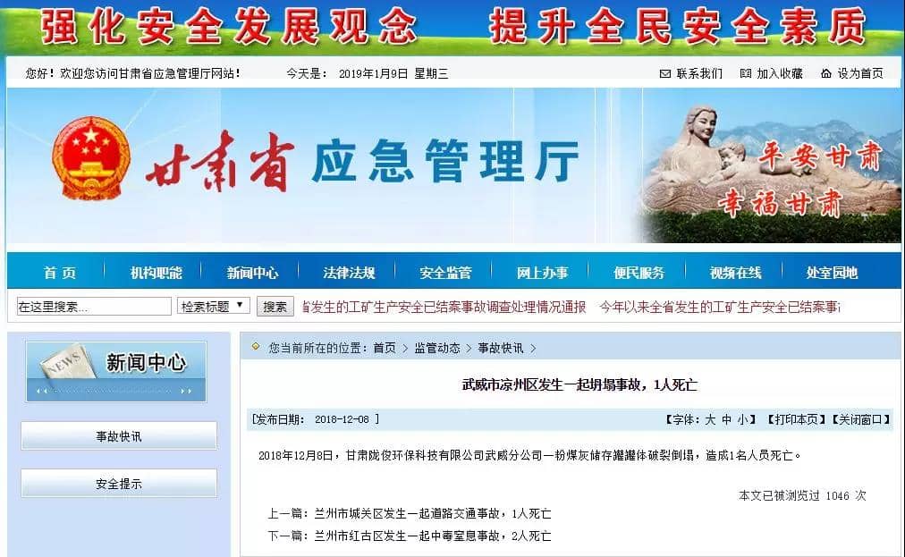 甘肅省安監(jiān)局消息:12月18日甘肅隴俊環(huán)??萍加邢薰疚渫止疽环勖夯覀}(cāng)儲(chǔ)罐體發(fā)生破裂倒塌,造成工作人員被埋,事故導(dǎo)致1人死亡。
