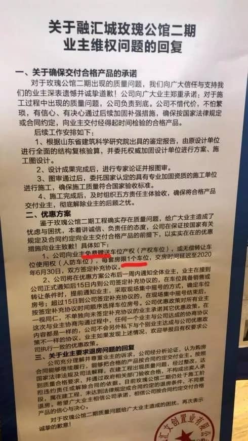 與此同時(shí),融匯城二期業(yè)主的維權(quán)已經(jīng)在同步進(jìn)行中了。根據(jù)業(yè)主的說(shuō)法,1月3號(hào)開(kāi)發(fā)商承諾出解決方案。但是1月3日開(kāi)發(fā)商現(xiàn)場(chǎng)公示僅允諾的對(duì)主體樓棟進(jìn)行加固,并贈(zèng)送業(yè)主車(chē)位產(chǎn)權(quán)或無(wú)償轉(zhuǎn)讓車(chē)位使用權(quán)(人防車(chē)位)。對(duì)于這個(gè)承諾業(yè)主并不滿意,尤其是在項(xiàng)目試圖掩蓋車(chē)庫(kù)坍塌事件、檢測(cè)主體結(jié)構(gòu)質(zhì)量再出問(wèn)題之后,業(yè)主對(duì)開(kāi)發(fā)商的信賴程度再打折扣,紛紛疾呼“我們要退房”。