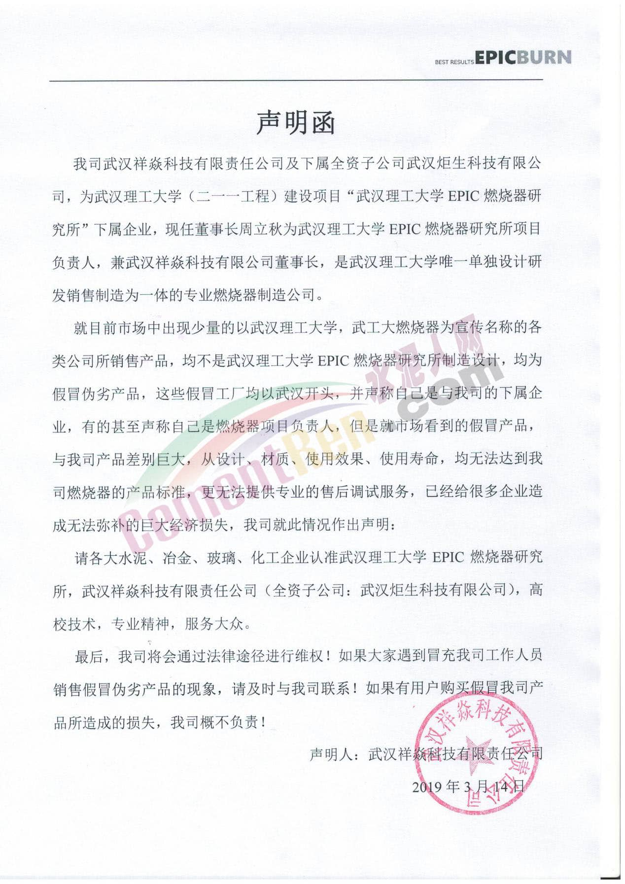 據(jù)武漢祥焱科技相關(guān)負(fù)責(zé)人介紹,目前市場上出現(xiàn)少量的以武漢理工大學(xué),武工大燃燒器為宣傳名稱的各類公司所銷售產(chǎn)品。這些產(chǎn)品均不是武漢理工大學(xué)EPIC燃燒器研究所制造設(shè)計,均為假冒偽劣產(chǎn)品。