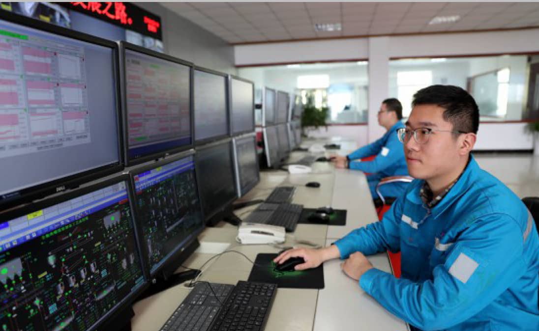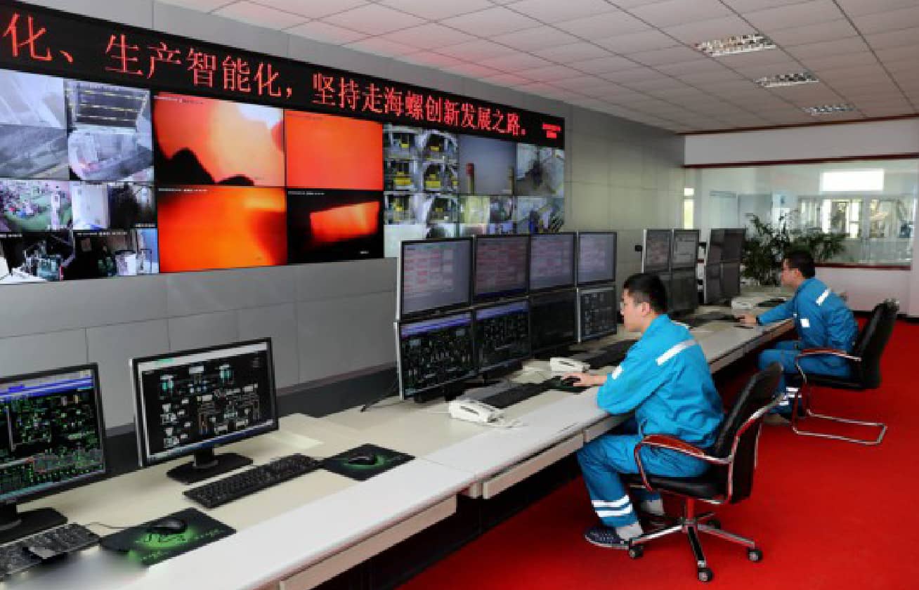 圖:在安徽全椒海螺水泥有限責(zé)任公司智能工廠,技術(shù)人員在中央控制室監(jiān)測(cè)工廠生產(chǎn)情況。