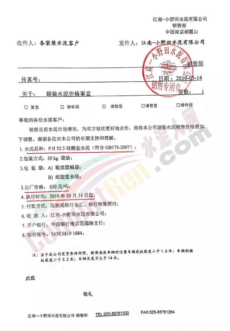2019年05月15日江蘇省南京市的江南一小野田水泥對(duì)包裝水泥價(jià)格上調(diào)50元/噸,調(diào)整后廠內(nèi)裝車價(jià)650元/噸!