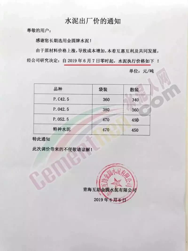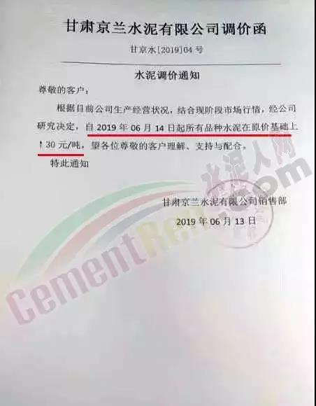 6月19日零時(shí)起甘肅祁連山水泥營(yíng)銷中心蘭州公司對(duì)夏河公司出廠的各品種袋裝水泥在現(xiàn)有價(jià)格基礎(chǔ)上上調(diào)15元/噸。