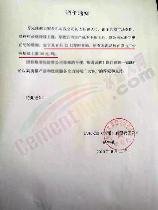 6月12日大理水泥(集團(tuán))有限公司各品種水泥價(jià)格上調(diào)30元/噸