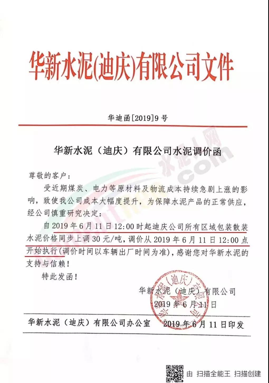 6月11日華新水泥(劍川)有限公司、華新水泥(迪慶)有限公司等水泥價(jià)格上調(diào)30元/噸