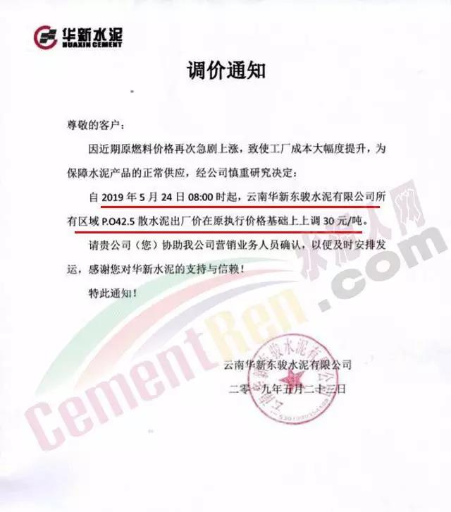 5月24日云南華新東駿水泥有限公司42.5散裝水泥上調(diào)30元/噸。