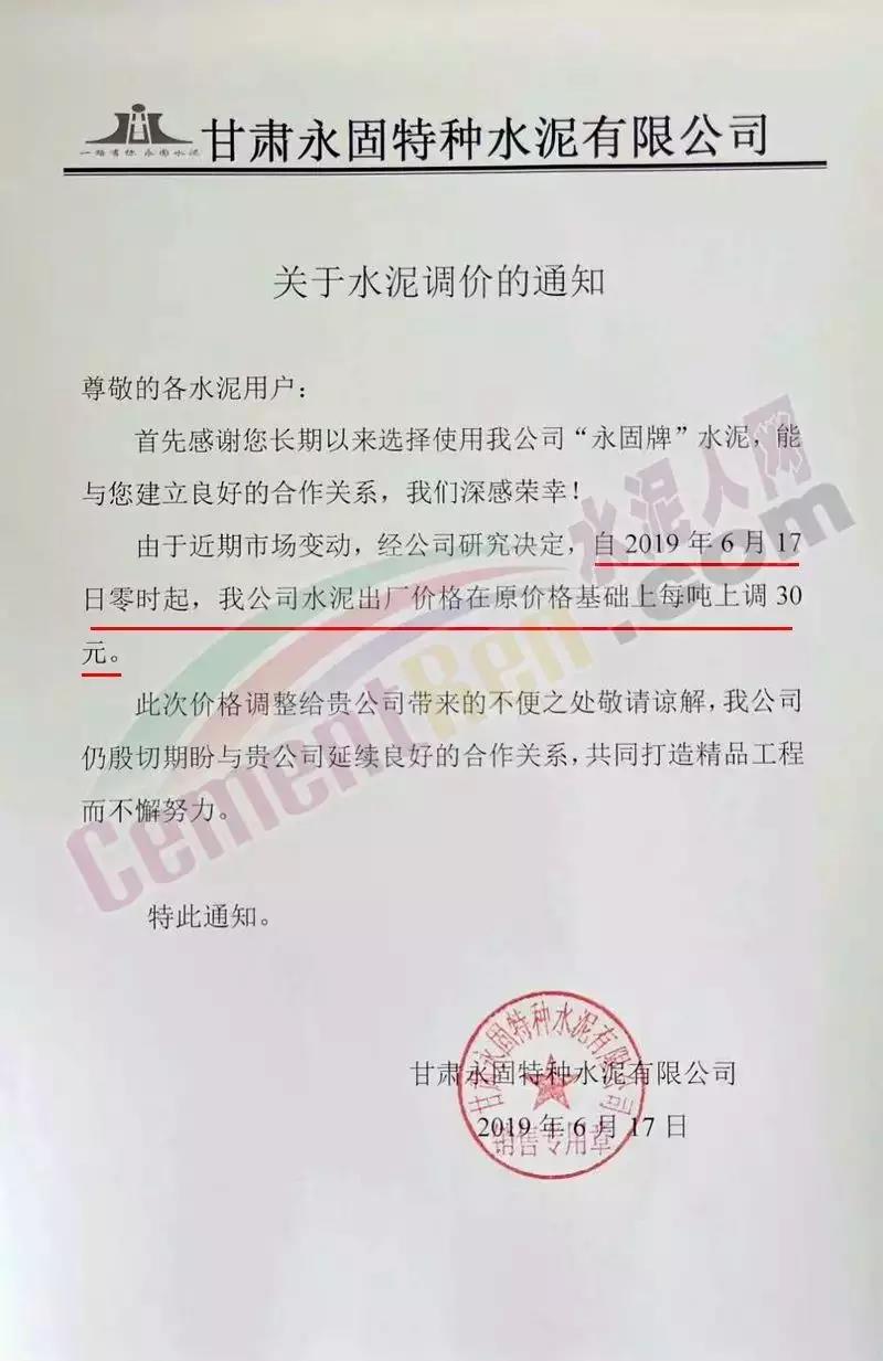 6月17日甘肅永固特種水泥有限公司水泥出廠價(jià)格在原價(jià)格基礎(chǔ)上每噸上調(diào)30元