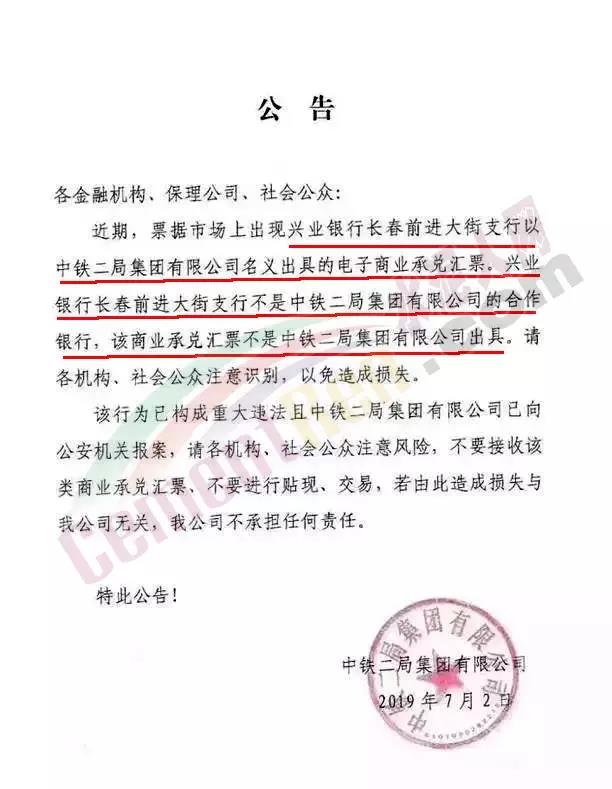 并且中鐵二局公司已經(jīng)向公安機關(guān)報案,請各機構(gòu)、社會公眾注意風(fēng)險,不要接收該類商業(yè)承兌匯票、不要進行貼現(xiàn)、交易,造成的損失中鐵二局不承擔責(zé)任。 說白了這票和中鐵二局沒有關(guān)系,到期可能無法兌付。