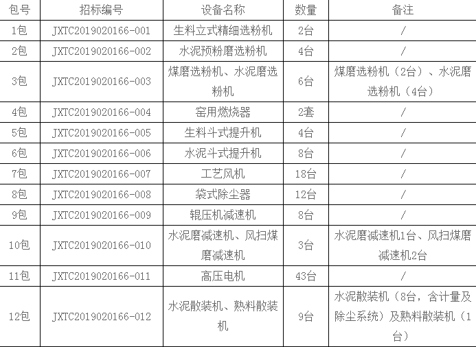 包12:近五年(2014年1月1日以來)內(nèi)投標(biāo)人在中國大陸至少有兩個(gè)生產(chǎn)能力4000噸/天及以上熟料水泥生產(chǎn)線或年產(chǎn)100萬噸及以上水泥粉磨站同類設(shè)備供貨業(yè)績(含改造項(xiàng)目)。
