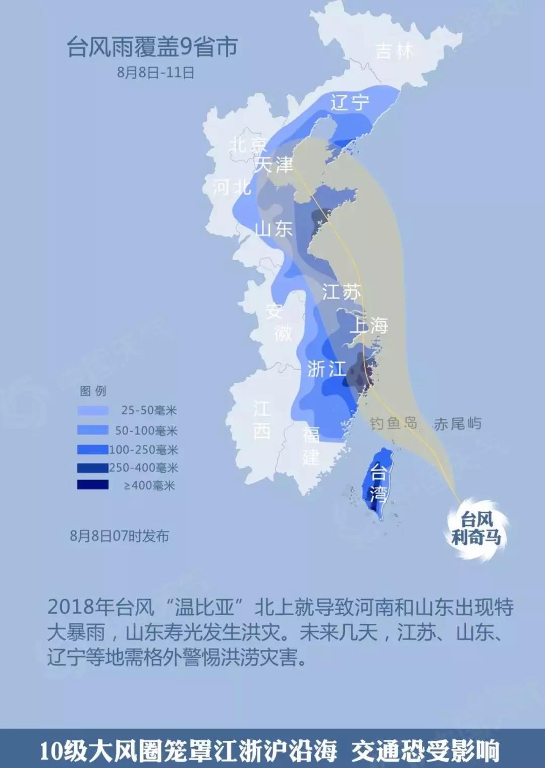 影響范圍廣——臺灣、福建、浙江、上海、江蘇、山東、天津、遼寧等8省市將受到臺風(fēng)直接影響。后期,臺風(fēng)和冷空氣結(jié)合還會給華北東部、東北等地帶來大范圍強降雨。