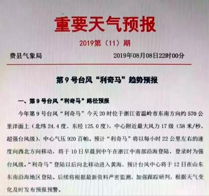 山東省氣象局發(fā)布第9號臺風(fēng)“利奇馬”預(yù)報稱,預(yù)計臺風(fēng)中心于11日下午至12日凌晨在山東半島至魯東南登陸。后期路徑存在一定的不確定性,穿過山東半島進入渤海的可能性較大。預(yù)計“利奇馬”外圍 云“系于10日下午開始影響山東省。