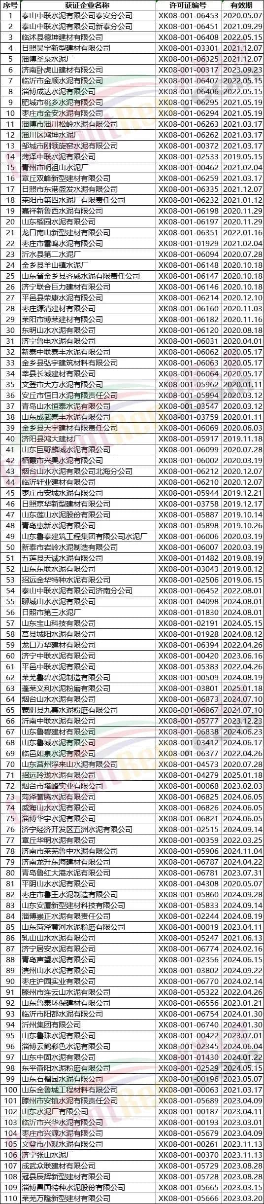 山東省部分水泥企業(yè)名單