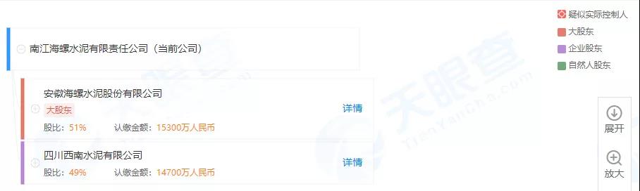 企業(yè)股東信息顯示,南江海螺水泥有限責(zé)任公司為海螺水泥與西南水泥的合資公司,兩者分別持股51%和49%。