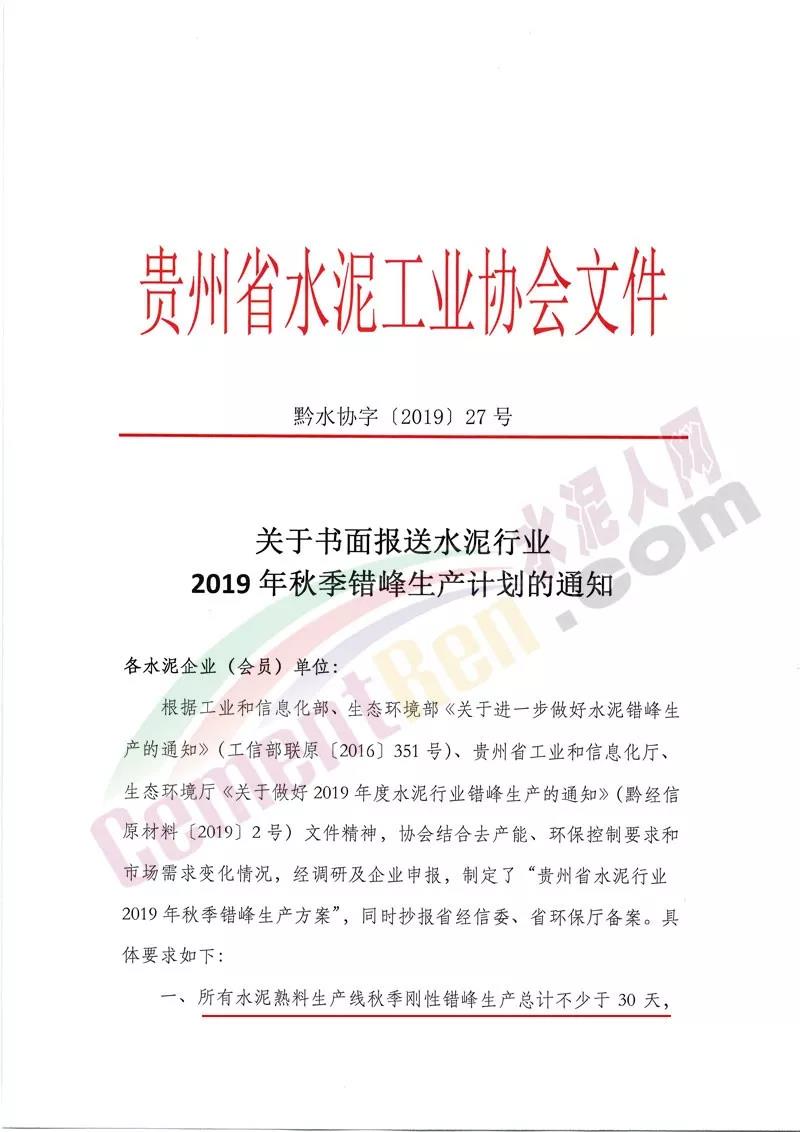 就在當(dāng)?shù)仄髽I(yè)一籌莫展之際,貴州省水泥協(xié)會(huì)緊急發(fā)布秋季錯(cuò)峰停產(chǎn)文件,要求省內(nèi)所有水泥熟料生產(chǎn)線秋季剛性錯(cuò)峰生產(chǎn)總計(jì)不少于30天,原則上每月錯(cuò)峰生產(chǎn)10天/窯。