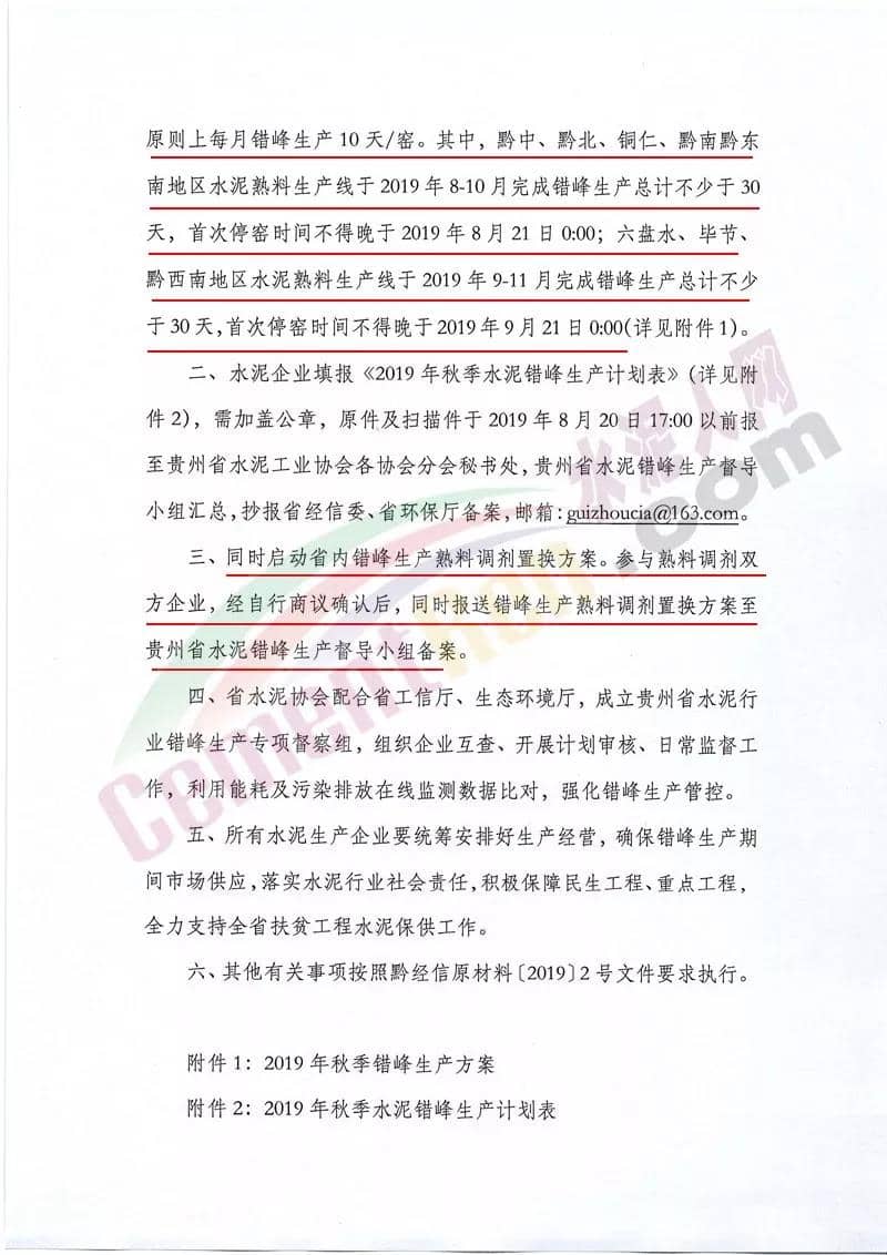其中,黔中、黔北、銅仁、黔南黔東南地區(qū)水泥熟料生產(chǎn)線于2019年8-10月完成錯(cuò)峰生產(chǎn)總計(jì)不少于30天,首次停窯時(shí)間不得晚于2019年8月21日0:00;六盤水、畢節(jié)、黔西南地區(qū)水泥熟料生產(chǎn)線于2019年9-11月完成錯(cuò)峰生產(chǎn)總計(jì)不少于30天,首次停窯時(shí)間不得晚于2019年9月21日0:00。