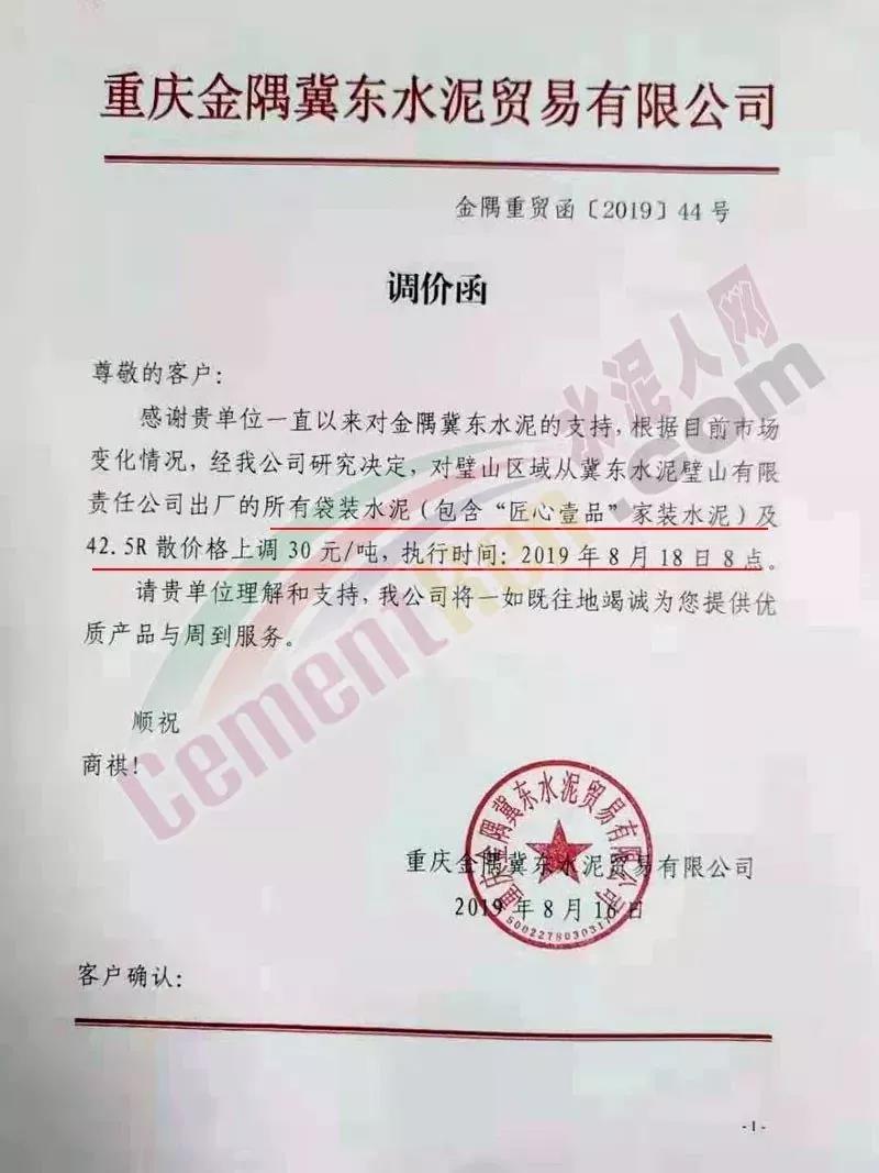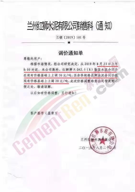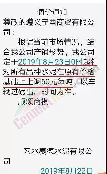 因近期原燃材料成本上漲,我公司現(xiàn)決定于2019年8月22日8:00針對(duì)PO42.5散裝價(jià)格進(jìn)行調(diào)整,價(jià)格上調(diào)60元/噸。