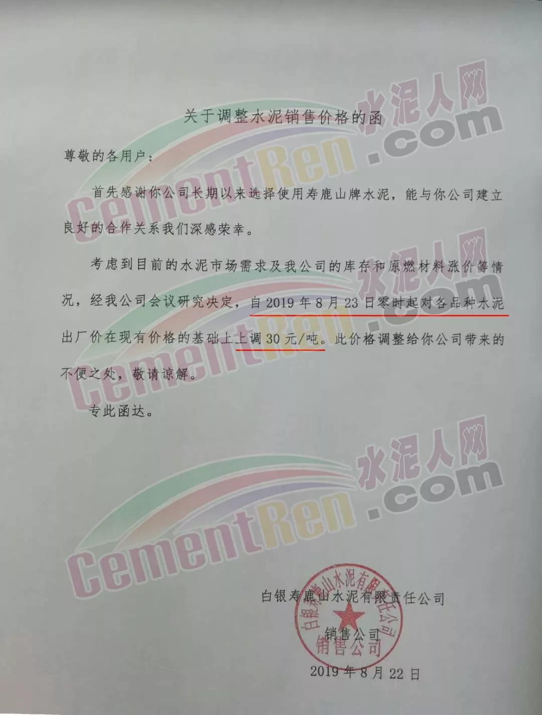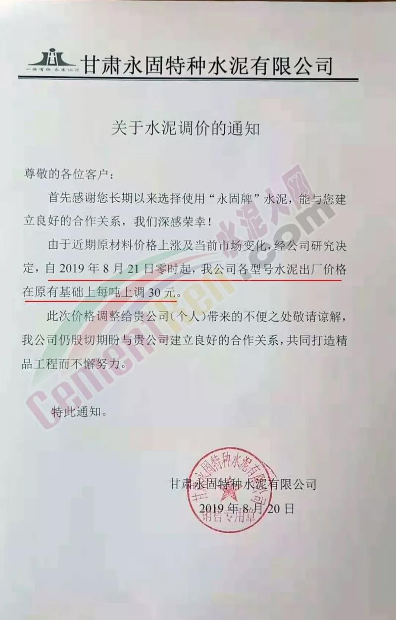 根據(jù)當(dāng)前市場(chǎng)形勢(shì)經(jīng)我公司研究決定,自2019年08月22日上午9:00點(diǎn)起所有水泥品種價(jià)格統(tǒng)一上調(diào)30元/噸。