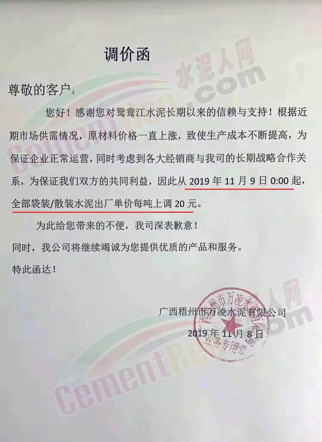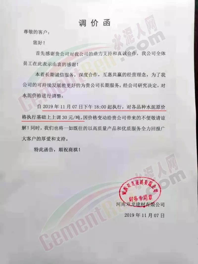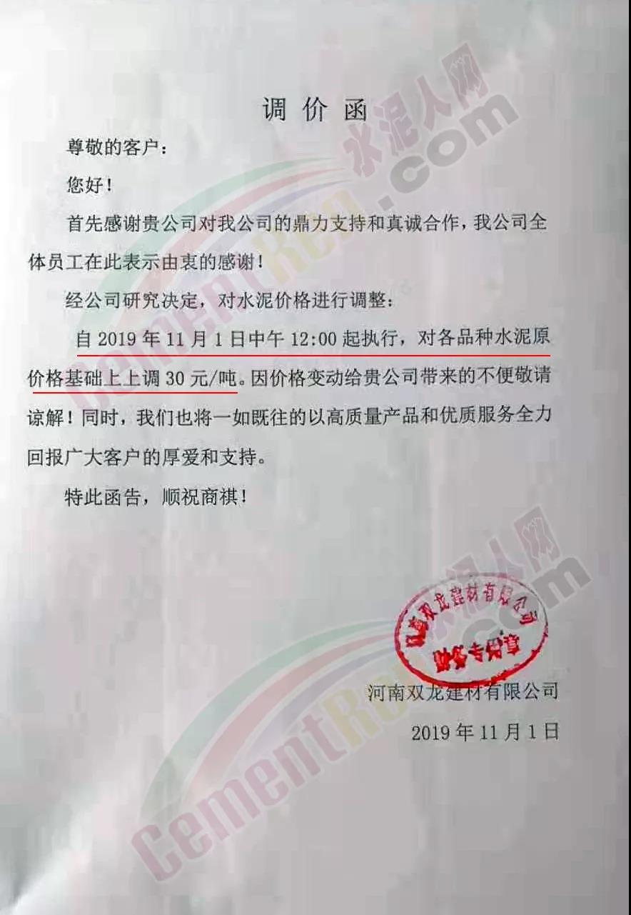 根據(jù)目前市場(chǎng)形勢(shì)及公司生產(chǎn)情況,我司決定于2019年11月9日00:00起,對(duì)廣西全區(qū)域各品種袋裝價(jià)格上調(diào)20元/噸、散裝價(jià)格上調(diào)30元/噸、熟料價(jià)格上調(diào)20元/噸。