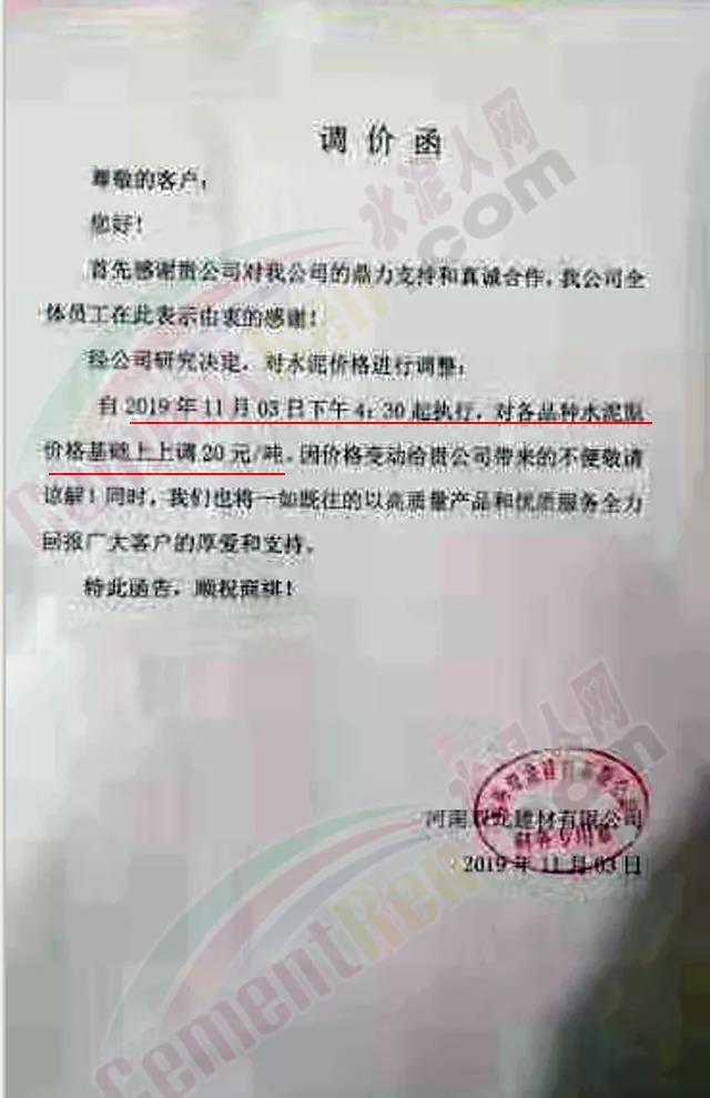 根據(jù)當(dāng)前市場(chǎng)形勢(shì)及產(chǎn)銷存實(shí)際情況,經(jīng)公司研究決定,定于2019年11月9日08:00起對(duì)各品種袋裝水泥價(jià)格上調(diào)20元/噸,對(duì)各品種散裝水泥價(jià)格上調(diào)30元/噸。