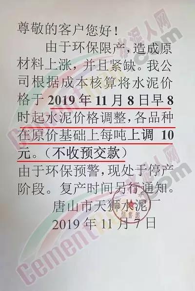 11月7日唐山一家粉磨站企業(yè)通知上調(diào)水泥價(jià)格。