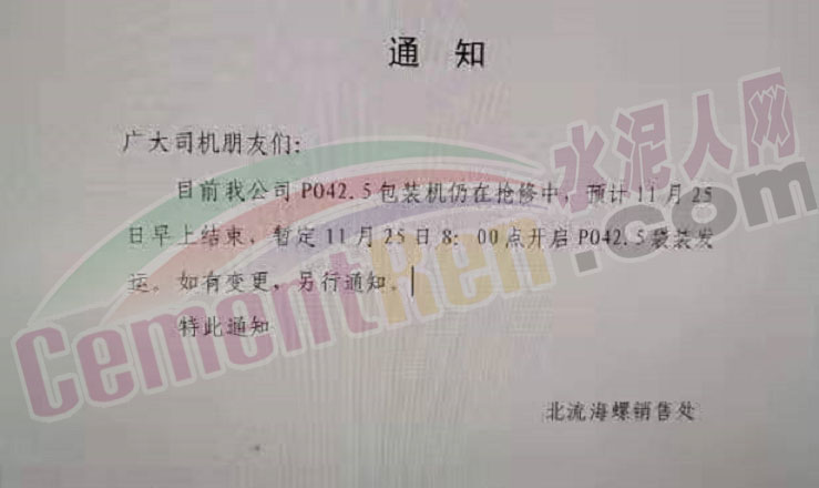 尊敬的各位客戶、司機(jī)朋友北流海螺PO袋裝生產(chǎn)線因設(shè)備故障需停機(jī)維修,計(jì)劃維修時(shí)間為2019年11月20日0點(diǎn)至2019年11月23日早上8點(diǎn),設(shè)備檢修期間42.5袋裝暫停發(fā)貨。