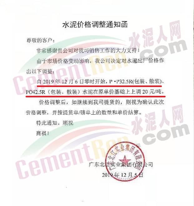 日前,廣東北江實(shí)業(yè)集團(tuán)有限公司發(fā)調(diào)價通知稱,由于市場價格變動影響,公司決定 對水泥出廠價格做出調(diào)整。自12月6日零時開始P.P32.5R(包、散裝)、PO42.5R(包裝、散裝)水泥在原單價基礎(chǔ)上上調(diào)20元/噸。