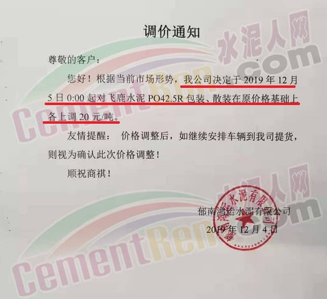 郁南鴻運(yùn)水泥有限公司通知自12月5日0時起對飛鹿水泥PO42.5R包裝、散裝在原價格基礎(chǔ)各上調(diào)20元/噸。