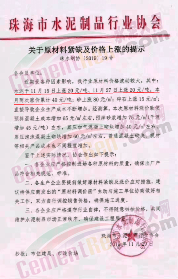 10月以來,廣東水泥經(jīng)歷了六輪連漲,漲幅達(dá)100元/噸以上。珠海市水泥制品行業(yè)協(xié)會此前發(fā)布《關(guān)于原材料緊缺及價格上漲的提示》稱,水泥價格于11月15日上漲20元/噸、11月27日上漲20元/噸,一個月內(nèi)累計(jì)上漲40元/噸。