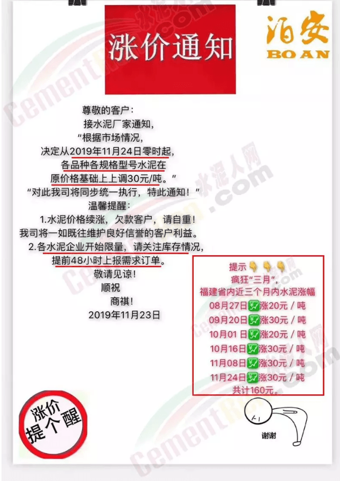 泊安水泥8月下旬至11月24日7連漲,累計(jì)漲價達(dá)到190元/噸。據(jù)了解更有甚者八月下旬至今8輪連漲,累計(jì)漲價達(dá)210元/噸。